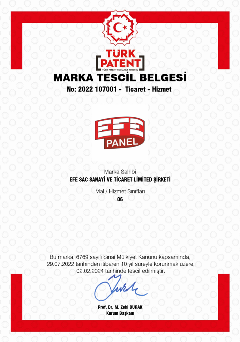 Efe Panel Marka Tescil Belgesi